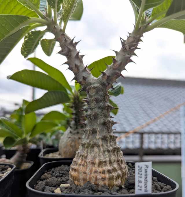 ウィンゾリー ウィンゾリー 2021.8実生 ウィンゾリー 2024.11.262025.10.03 Pachypodium baronii var. windsorii 目次 2021.8.21播種2022.52022.62023.42024.2 2年半経過2024.5.162024.7.82024.8.242024.11.252025.10.2 2021.8.21播種 2022.5 2022.6 もうすぐ1年になる。思ったより成長していない 2023.4 2024.2 2年半経過 劇的な成長はしていないが、野性味あふれる樹形になってきた 2024.5.16 2024.7.8 上段右が2024に開花株 2024.8.24 2024.11.25 2025.10.2