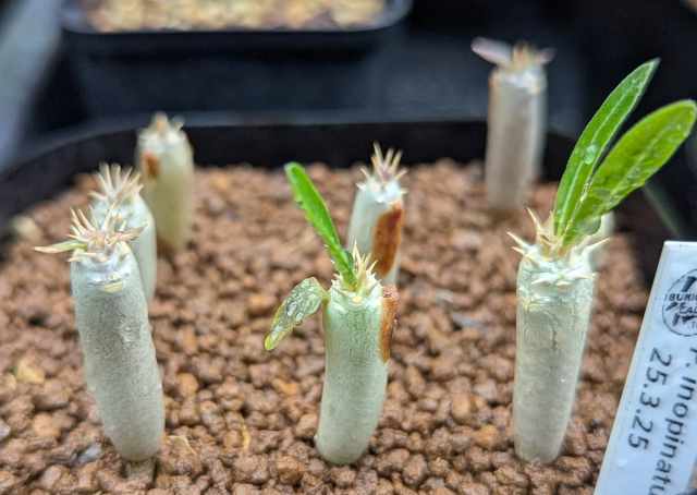 イノピナツム パキポディウム塊根植物実生 イノピナツム 2025.3 実生 イノピナツム 2025.06.062025.09.23 Pachypodium rosulatum var. inopinatum 南アフリカから輸入発芽率は1割ほどカビの猛攻に負けずに発芽してくれた 2025.6.6 まもなく3ヶ月。葉焼けしてるのに伸びてる。バランスが難しい。 2025.9.21